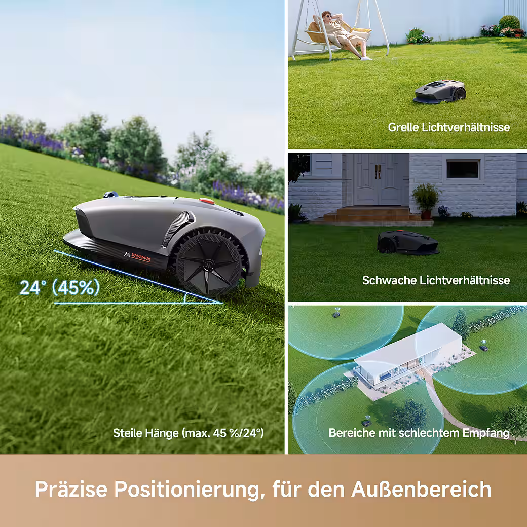 Der Roboter berechnet automatisch die effizientesten Mähwege und sorgt für eine gleichmäßige Rasenpflege. Bei niedrigem Akkustand kehrt er dank Kamera-, Infrarot- und elektromagnetischer Navigation selbstständig zur Ladestation zurück.
