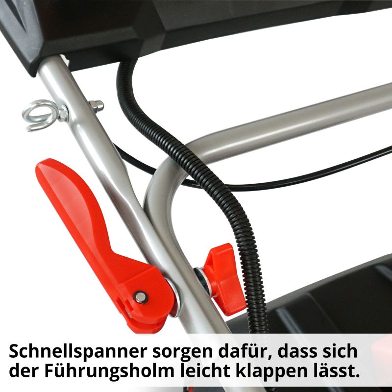 Der Führungsholm ist mit einem Super-Softgriff ausgestattet und lässt sich über Schnellspanner platzsparend zusammenklappen. Ein praktischer Frontgriff erleichtert den Transport und die Reinigung des robusten Stahlgehäuses nach getaner Arbeit.