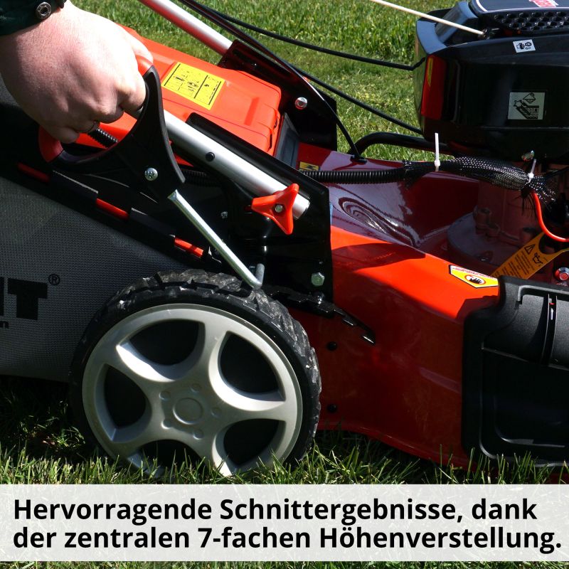Zentrale Schnitthöhenverstellung: Passen Sie Ihren Rasen in 7 Stufen (25–75 mm) individuell an Ihre Bedürfnisse an.